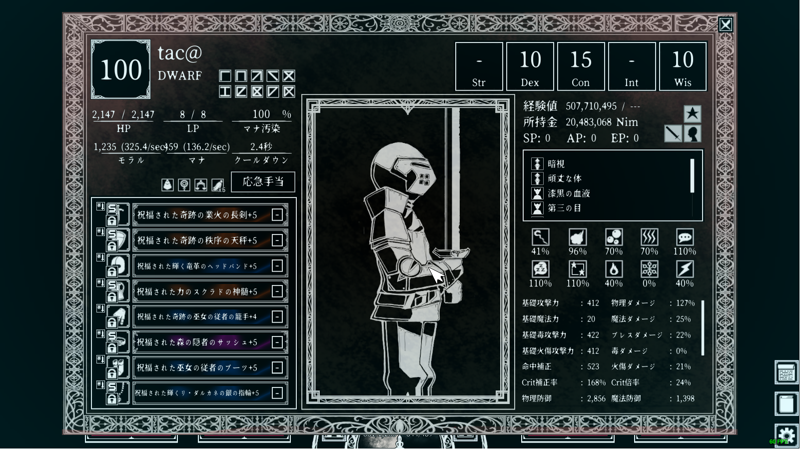 | 破滅 | ダメージ補正(物理,魔法,火傷,毒),Crit倍率,状態異常発生率(毒,睡眠,感電,),DMG変換(DEX・WIS),特攻(動物,植物,死者,悪魔,) |