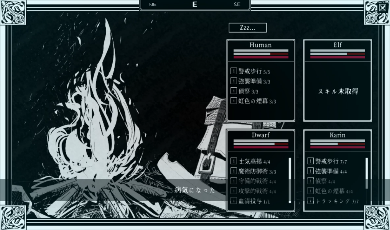 休息すると、「病気になった」と表示され、パーティメンバーが病気になることがある。